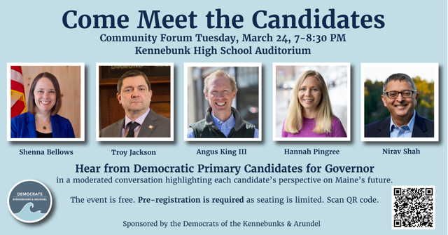 Mark your calendar for Tuesday, March 24! Plan now to attend this community forum to hear these gubernatorial candidates and compare their visions for Maine. USE THIS LINK or the QR code to register (required) for limited seating. Please invite others to join you. Send your questions for the candidates to Carol Morris, and we’ll make sure the program reflects your concerns.